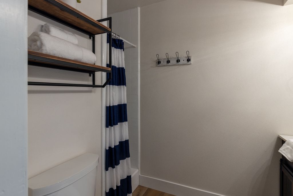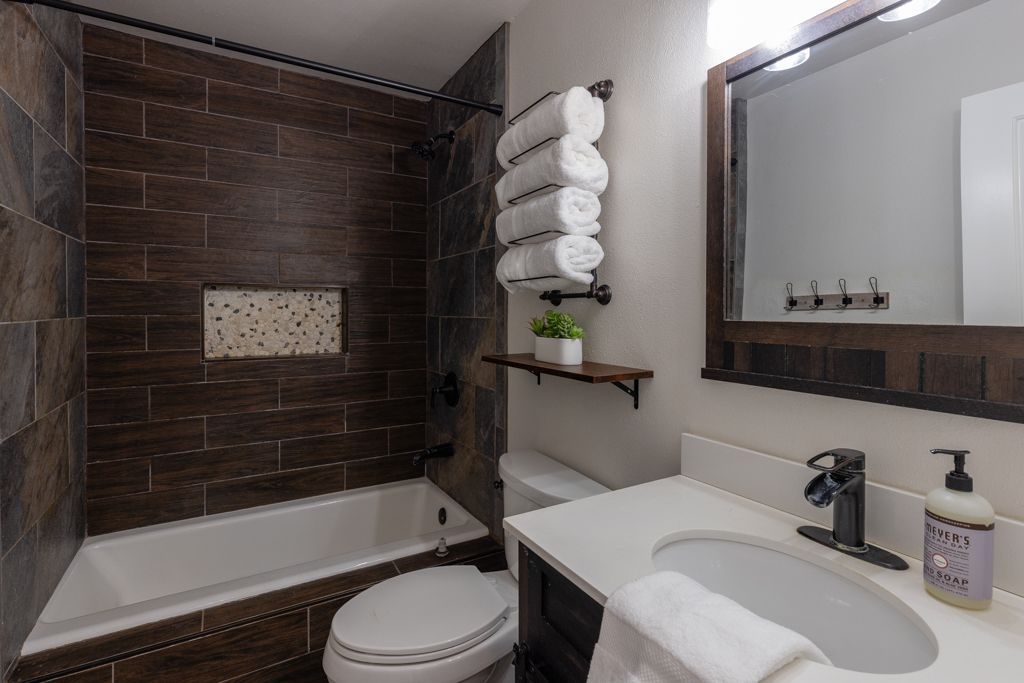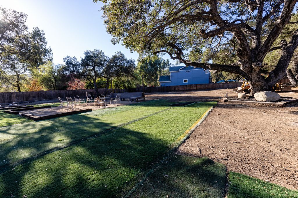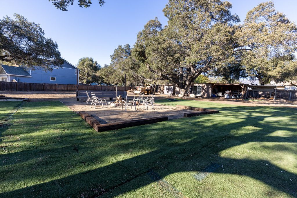 Outdoor living is made easy with a large firepit and custom seating, along with a horseshoe pit. The backyard offers room for further outdoor projects or relaxation under the oak trees.